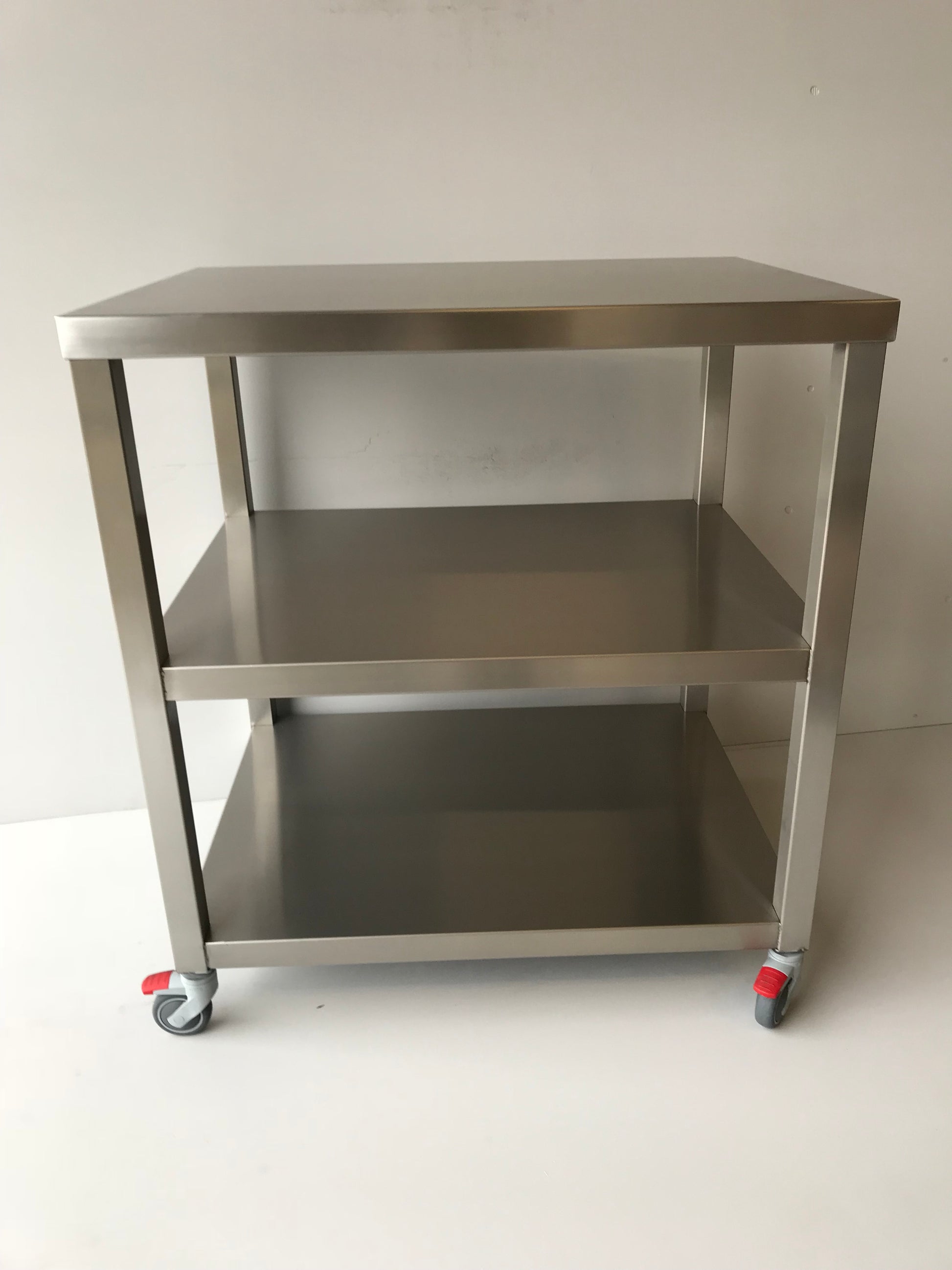 Een trolley van roestvrijstaal met een bovenblad en twee keer een rvs schap.